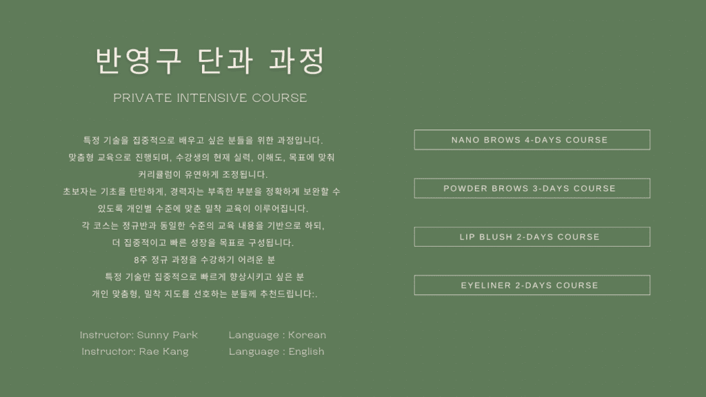 더불어 사진 편집, 마케팅 전략, 고객 응대까지 샵 오픈을 위한 전반적인 준비를 돕는 실전형 수업으로 구성되어 있습니다. - 반영구 단과 과정 (Private Intensive Courses)